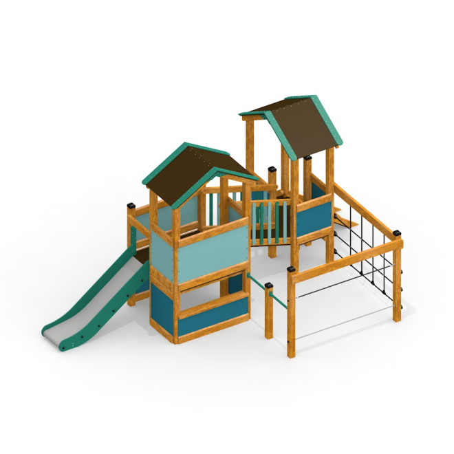 Tower Nature dibuat dari kayu larch berkualitas tinggi yang tahan lama, dilengkapi dengan baja galvanis dan stainless steel yang kuat untuk memastikan kestabilan struktur. Elemen-elemen seperti tali PP yang diperkuat dan rantai stainless steel menambah daya tahan serta keamanan, sementara bahan HDPE daur ulang dan plywood tahan air anti-slip memberikan permukaan yang nyaman dan aman bagi anak-anak saat bermain.